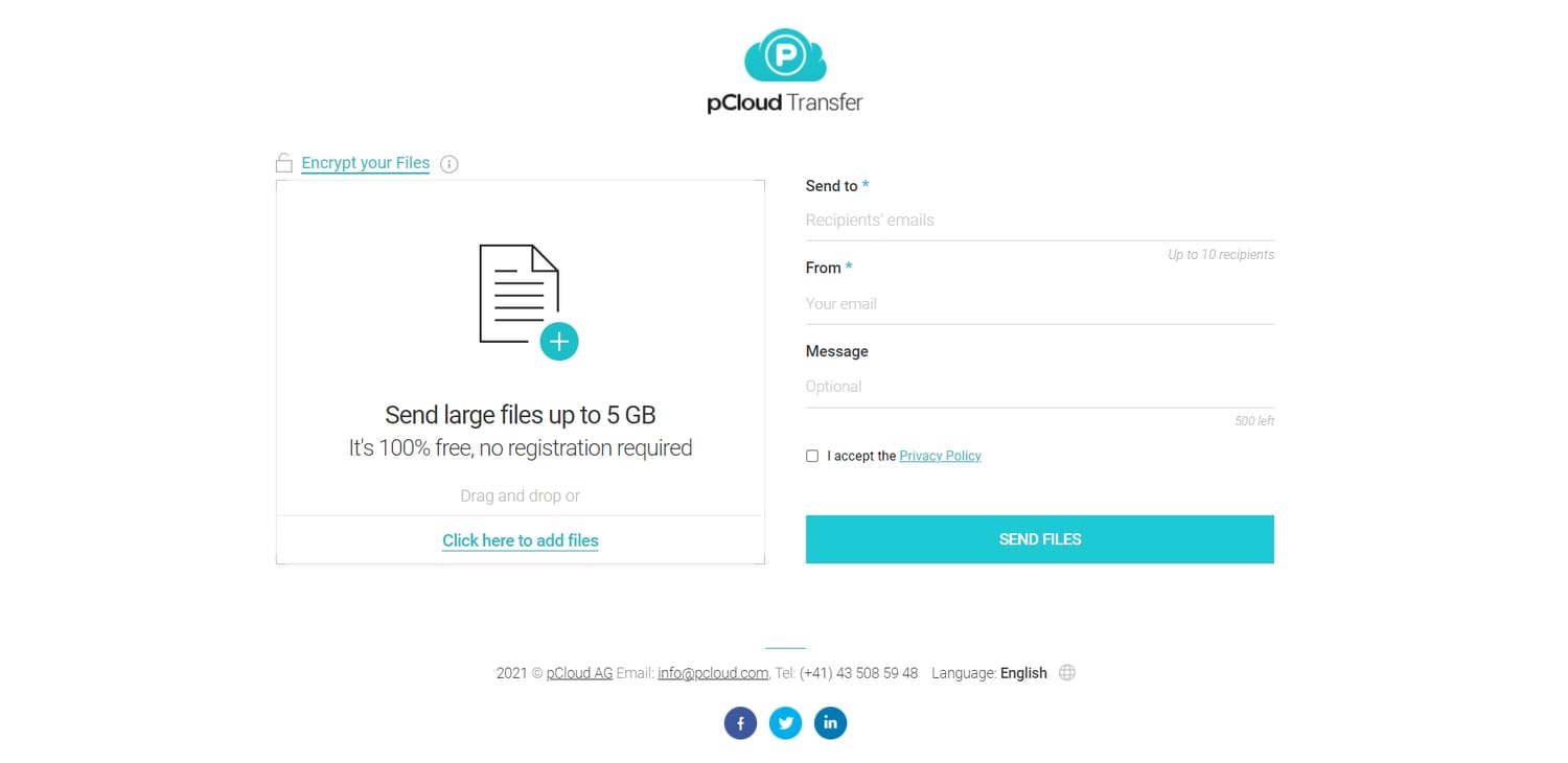 pCloud Transfer permet d’envoyer des fichiers volumineux de manière sécurisée avec chiffrement, sans créer de compte.