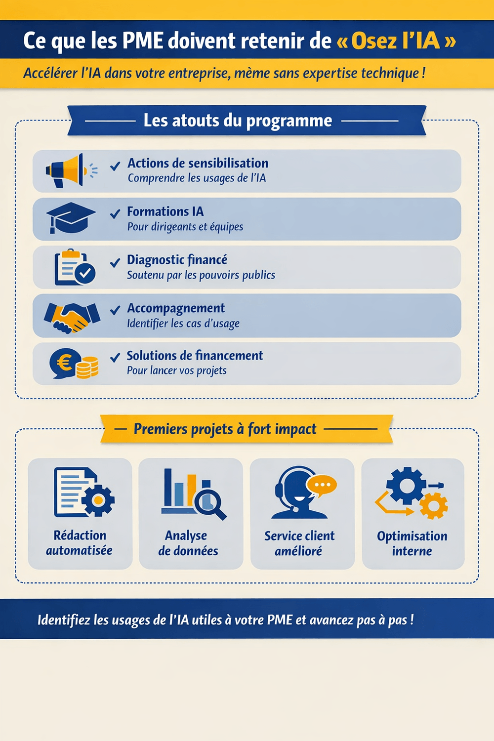 Le programme « Osez l’IA » s’inscrit dans la stratégie française de développement de l’intelligence artificielle. L’objectif est clair : diffuser l’IA dans l’ensemble du tissu économique, en particulier dans les PME qui constituent la majorité des entreprises en France.